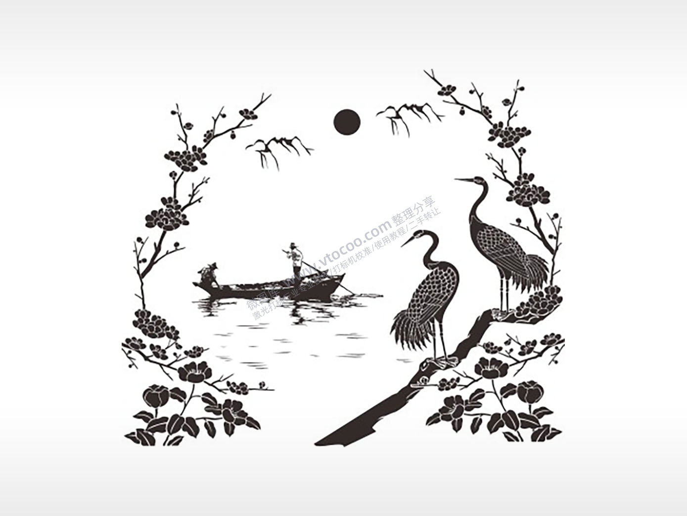 仙鹤河边渔船泼墨山水画匾额AI8.0格式激光打标文件通用矢量图